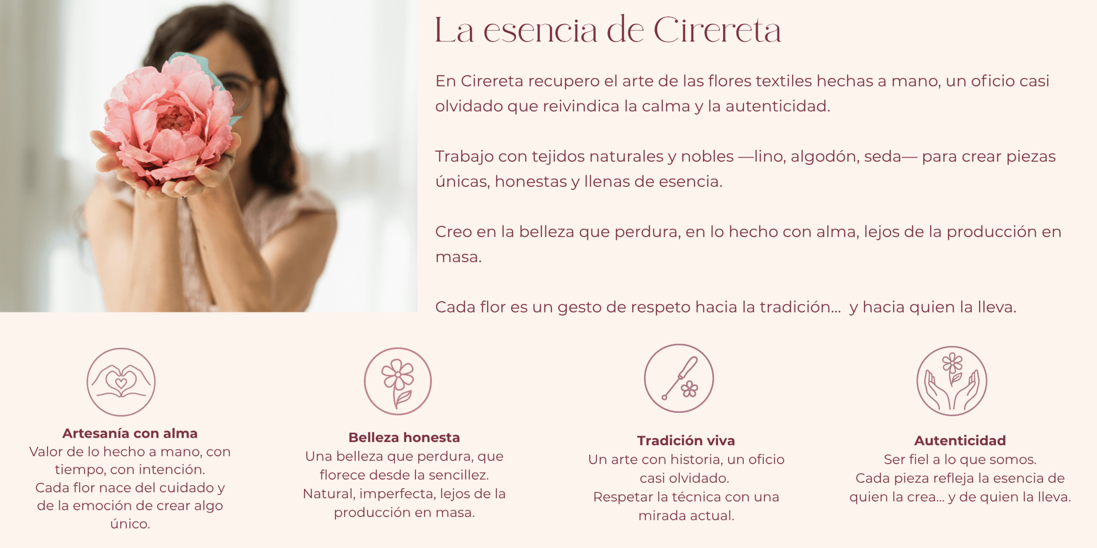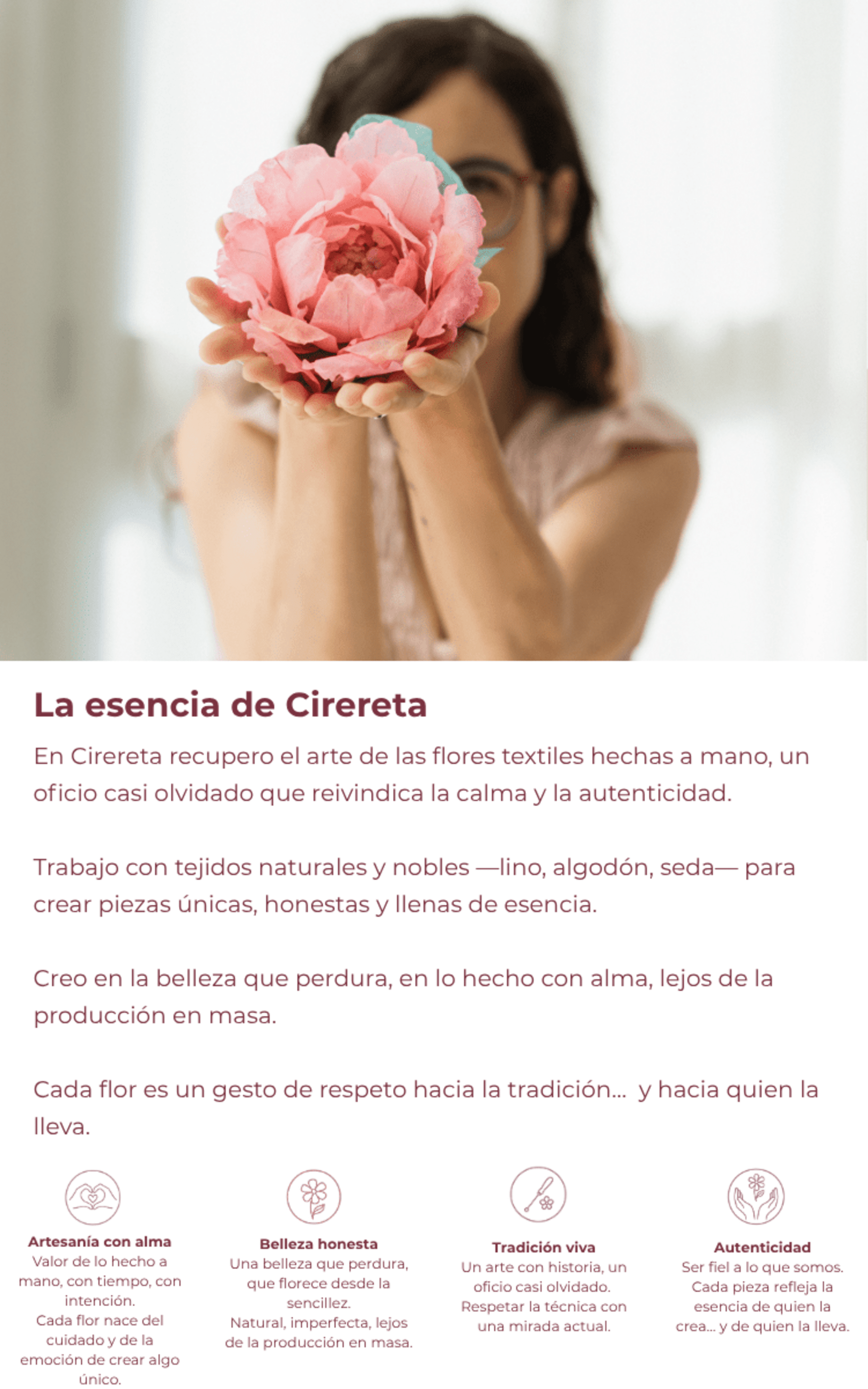 En mi taller transformo hilos y tejidos en flores hechas a mano, creadas con calma y sensibilidad. Cada pieza es un pequeño homenaje a la tradición, a la belleza sincera y al valor de lo hecho con dedicación.