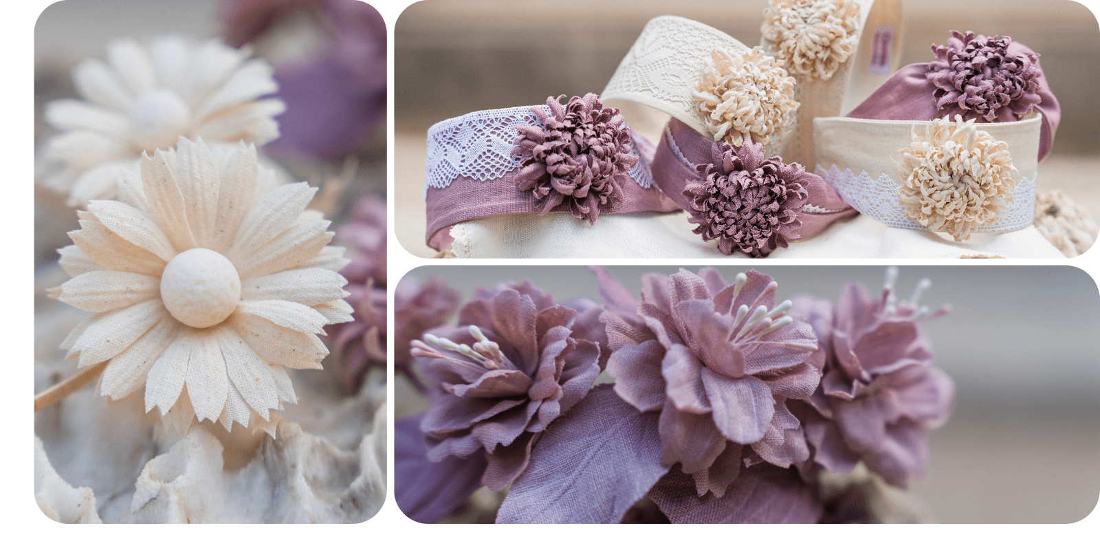 Trabajo principalmente con tejidos naturales como la seda, el lino o el algodón, aunque, si el encargo lo requiere, puedo recurrir a otros materiales para crear justo lo que imaginas. Me atraen las materias nobles porque aportan autenticidad: cada flor respira naturalidad, sin artificios.