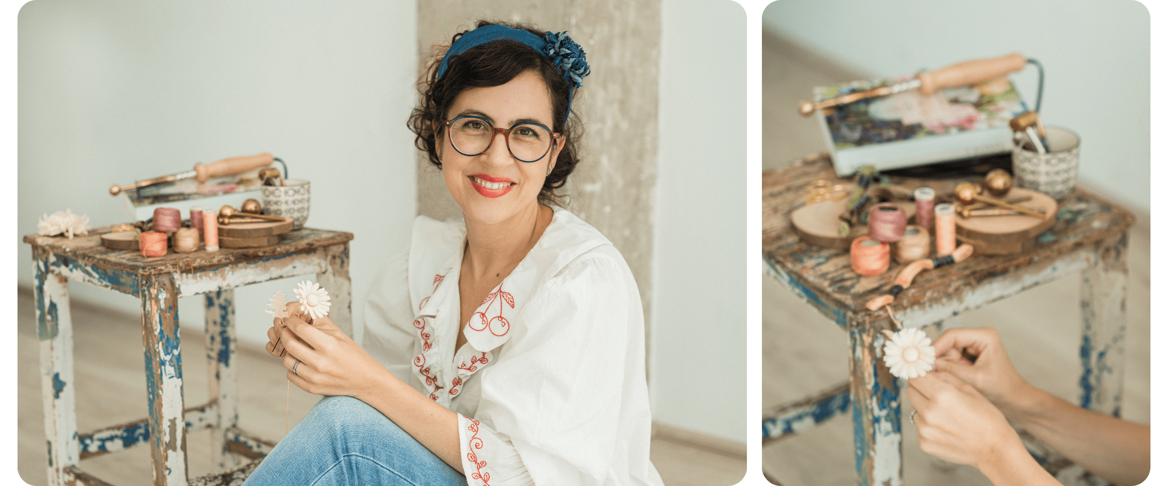 Dejé mi profesión de psicóloga para dar espacio a mi instinto creativo. Lo que siempre había estado latente en mí se convirtió en un camino real: formarme en moda artesanal, tocados y, sobre todo, en la creación de flores textiles.